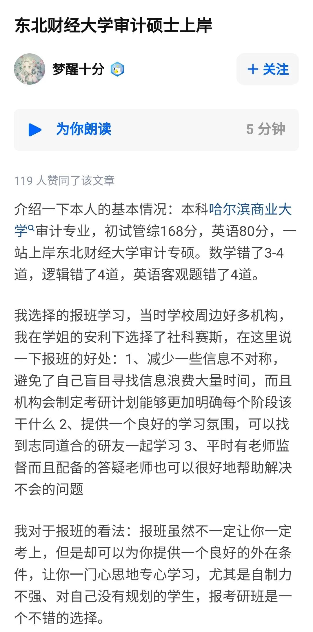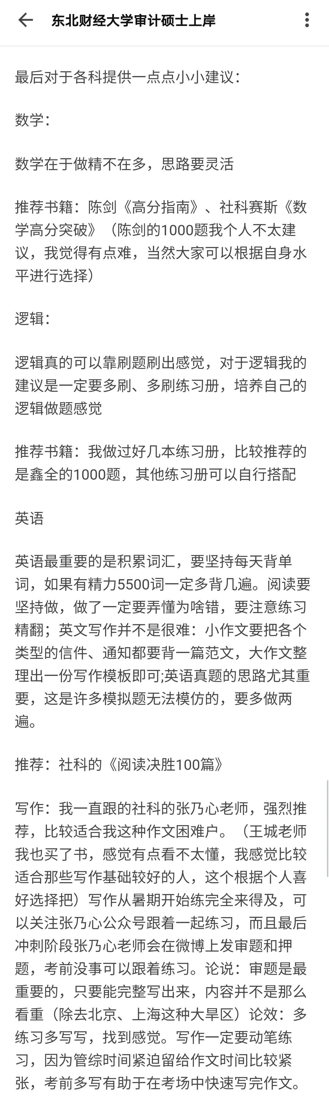 本科哈爾濱商業(yè)大學(xué)審計(jì)專業(yè),初試管綜168分,英語(yǔ)80分,一戰(zhàn)上岸東北財(cái)經(jīng)大學(xué)審計(jì)專碩。數(shù)學(xué)錯(cuò)了3-4道,邏輯錯(cuò)了4道,英語(yǔ)客觀題錯(cuò)了4道。