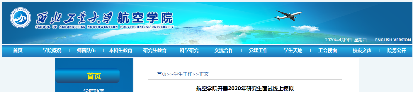 考研復(fù)試工作安排,西北工業(yè)大學(xué)發(fā)布了關(guān)于2020年碩士研究生招生工作的提示內(nèi)容,小編為大家整理了“西北工業(yè)大學(xué):航空學(xué)院開(kāi)展2020年研究生面試線上模擬”,希望對(duì)大家有所幫助!