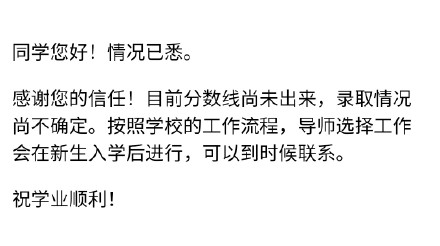 通常情況下,導(dǎo)師并不會(huì)給你一個(gè)直接的回復(fù),很可能是一個(gè)比較官方的回答,例如下面的回復(fù),除了你的初試成績(jī),也關(guān)注面試表現(xiàn),從面試綜合考察學(xué)生。