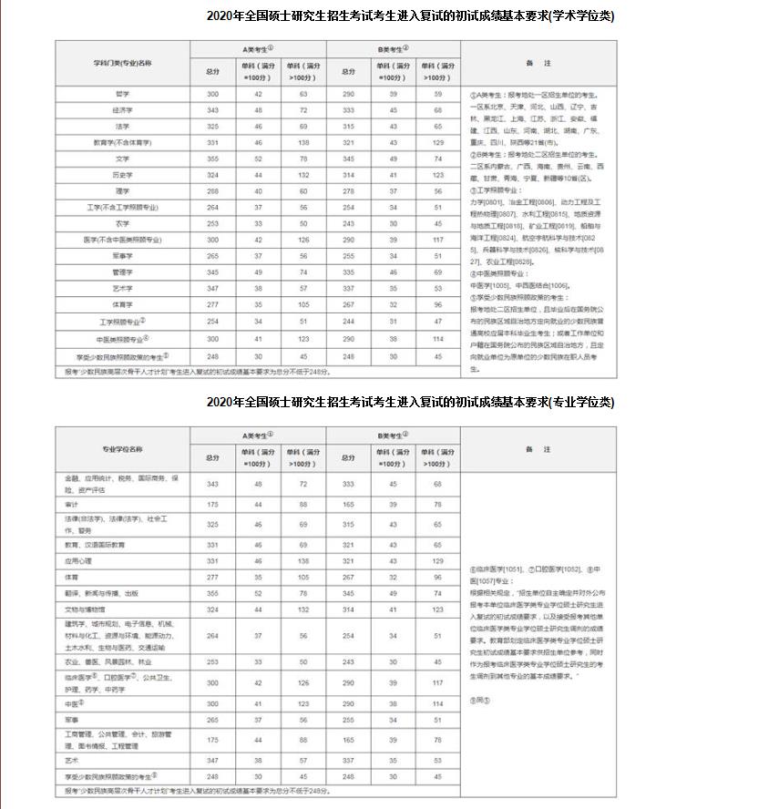 1、初試外語(yǔ)、政治、業(yè)務(wù)一、業(yè)務(wù)二、總分須分別達(dá)到國(guó)家劃定的《2020年全國(guó)碩士研究生招生考試A類考生進(jìn)入復(fù)試的初試成績(jī)基本要求》(不含“退役大學(xué)生士兵計(jì)劃”)。