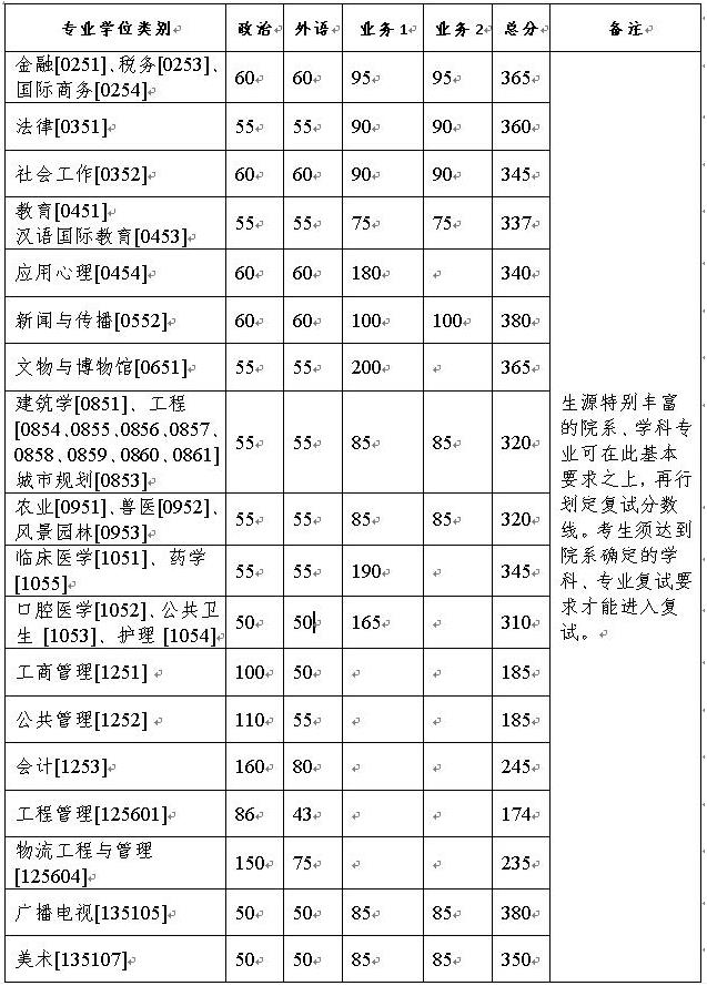 1.總分成績不低于上表中復試分數(shù)線基本要求的總分,滿分為100分的科目成績不低于50分,滿分為150分的科目成績不低于75分,滿分為200分的科目成績不低于100分,滿分為300分的科目成績不低于150分,符合上述條件的考生可參加退役大學生士兵專項計劃的復試。