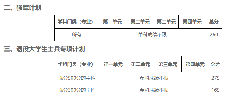單科成績(jī)不限,總分不低于對(duì)應(yīng)統(tǒng)考的學(xué)科門類(專業(yè))學(xué)校分?jǐn)?shù)線的90%(四舍五入取整)。