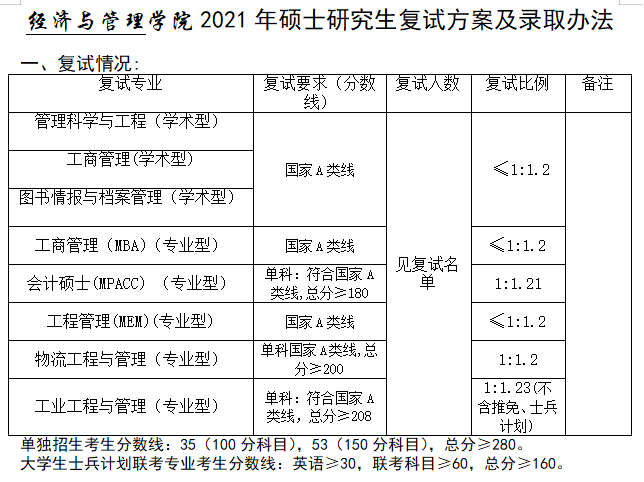 (二)退役大學(xué)生士兵專(zhuān)項(xiàng)計(jì)劃考生進(jìn)入復(fù)試的初試成績(jī)基本要求為初試總成績(jī)?yōu)?00分的,須達(dá)到教育部公布的2021年全國(guó)碩士研究生招生進(jìn)入復(fù)試的初試成績(jī)基本要求(A線(xiàn)),單科不低于30分;初試總成績(jī)?yōu)?00分的,總分不低于190分,單科不低于30分。