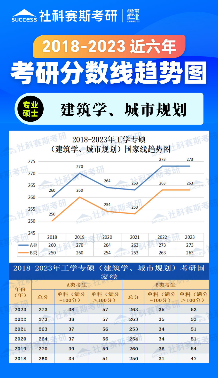 2023考研分數(shù)線:2018-2023年工學(xué)專碩(建筑學(xué)、城市規(guī)劃)近六年考研分數(shù)線趨勢圖