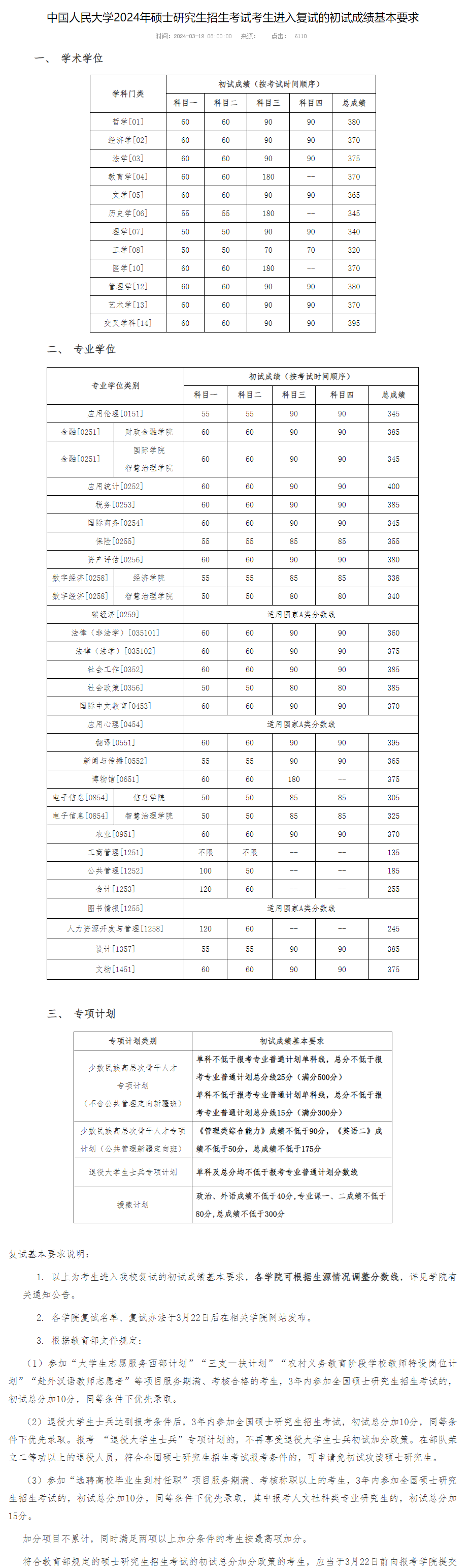 2024考研34所自主劃線院校分數(shù)線:中國人民大學2024年碩士研究生招生考試考生進入復試的初試成績基本要求