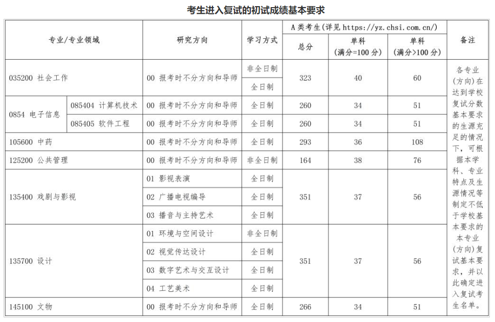 根據(jù)教育部公布的《2025年全國(guó)碩士研究生招生考試考生進(jìn)入復(fù)試的初試成績(jī)基本要求》,我校社會(huì)工作碩士、電子信息碩士、中藥碩士、公共管理碩士、戲劇與影視碩土、設(shè)計(jì)碩士及文物碩士,均以此要求中A類考生的總分及單科成績(jī)要求為基準(zhǔn)來(lái)確定考生進(jìn)入我校復(fù)試的基本成績(jī)要求及復(fù)試名單。報(bào)考同一專業(yè)的全日制學(xué)習(xí)方式考生和非全日制學(xué)習(xí)方式考生成績(jī)要求相同??忌M(jìn)入我校復(fù)試基本成績(jī)要求見下表: