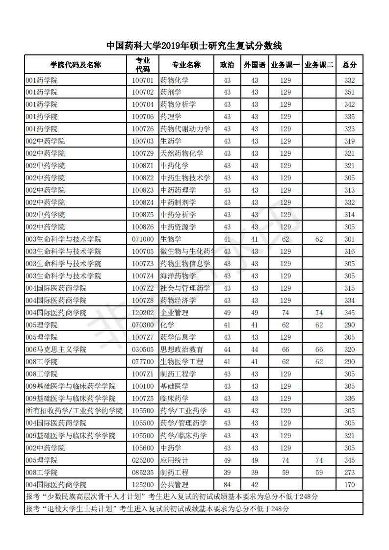 中國藥科大學(xué)2019年考研復(fù)試分?jǐn)?shù)線