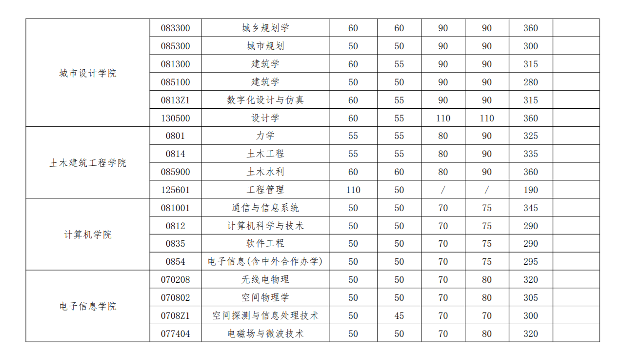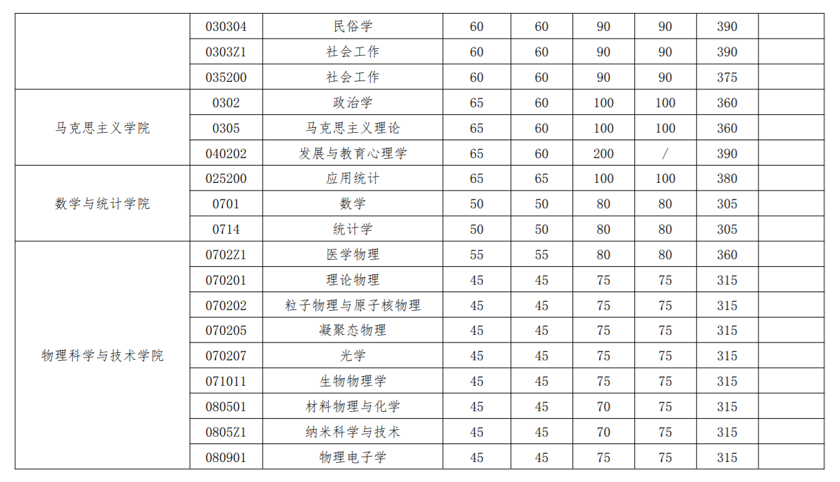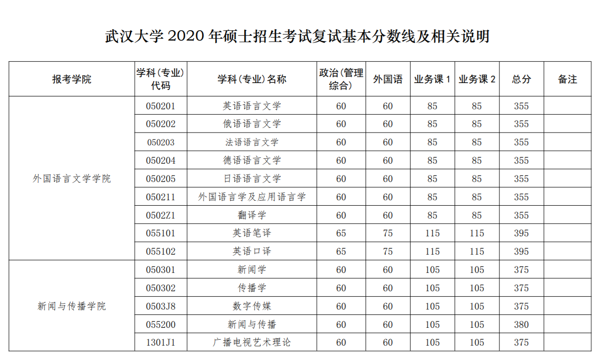 繼2020考研國家線公布后,34所自主劃線院校和各大院校也陸續(xù)公布2020年復試分數(shù)線。武漢大學已經(jīng)公布2020年碩士研究生入學考試復試基本分數(shù)線,如下所示: