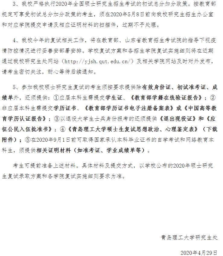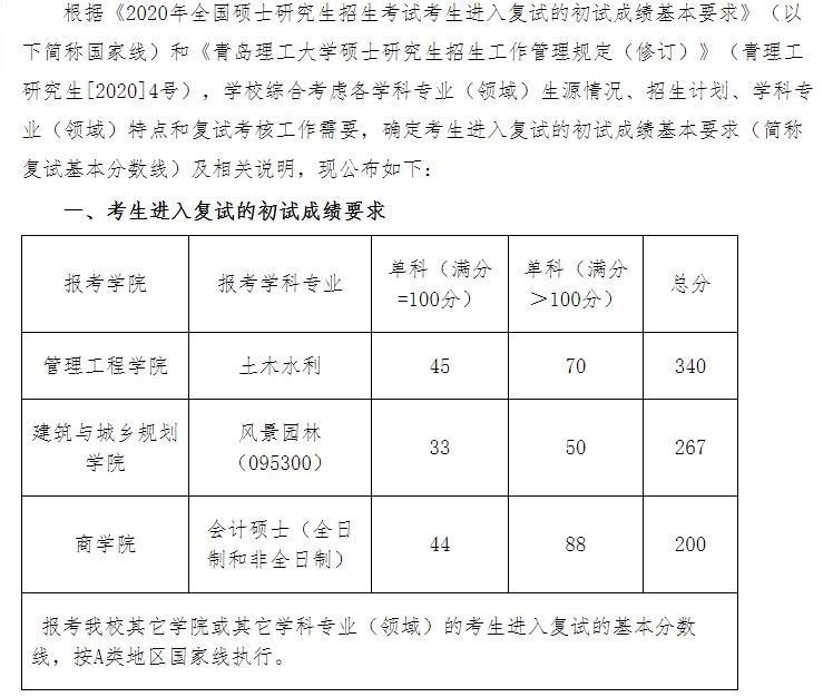 2020考研分數線:青島理工大學2020年碩士招生考試考生進入復試的初試成績基本要求及相關說明