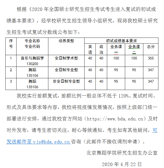 分數(shù)線。北京舞蹈學院已經(jīng)公布2020年碩士研究生入學考試復試基本