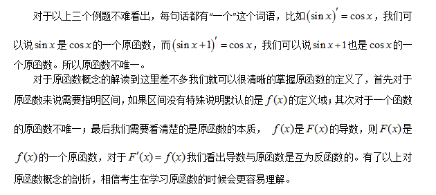 對(duì)于不定積分的定義是在原函數(shù)的定義上定義的,所以清楚的原函數(shù)的定義,會(huì)對(duì)后面學(xué)習(xí)不定積分的時(shí)候有很大的幫助。