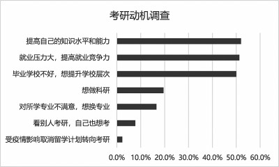 通過對考研動(dòng)機(jī)的調(diào)查分析,超過半數(shù)考生讀研目的是為了提升自身的知識水平和能力,以及由于就業(yè)壓力大,提高就業(yè)競爭力;認(rèn)為畢業(yè)學(xué)校不好,想提升學(xué)校層次為另外一個(gè)重要因素。此外,受疫情因素影響導(dǎo)致出國留學(xué)受阻轉(zhuǎn)向國內(nèi)考研成為新的考研動(dòng)因。