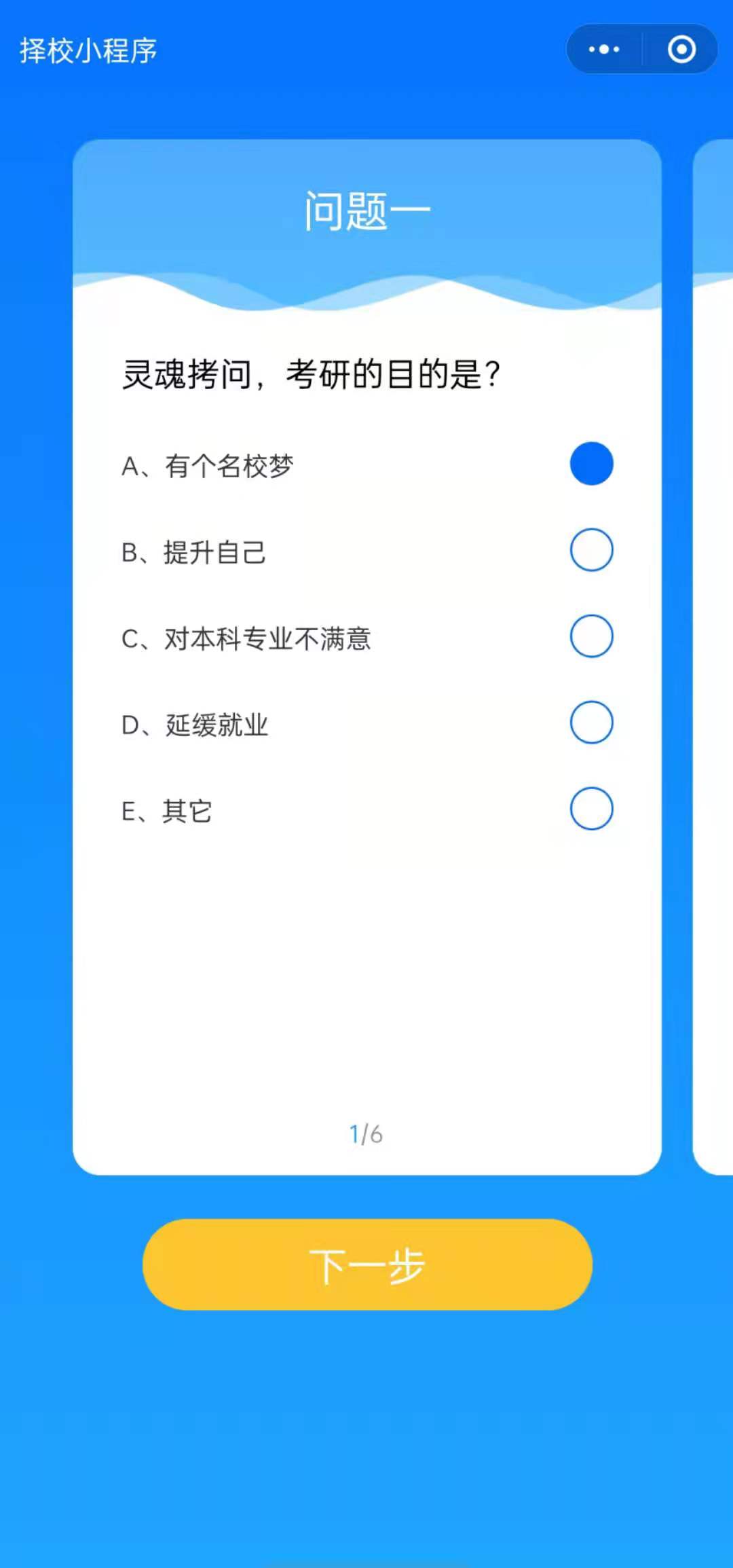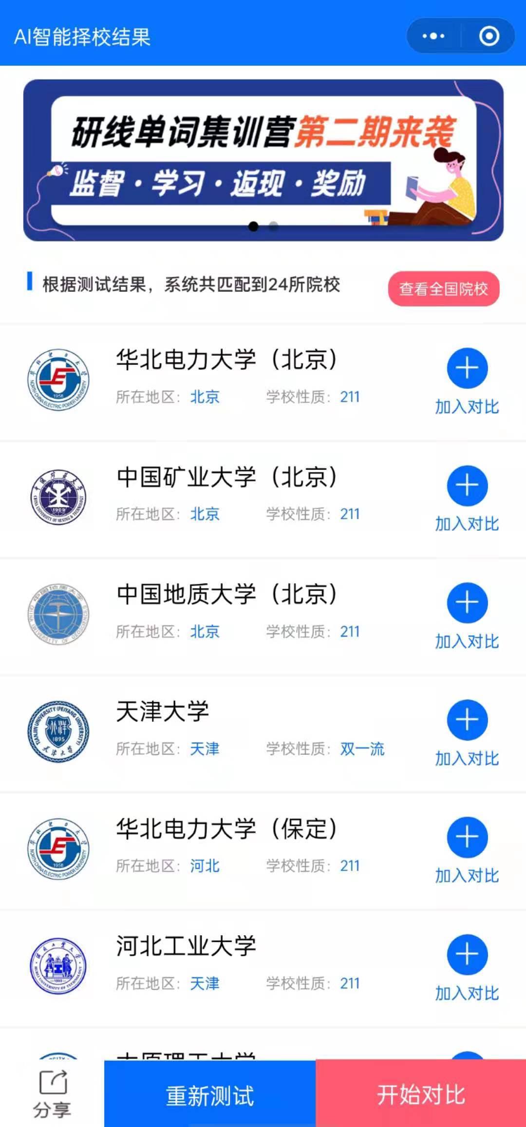 有的同學(xué)對于擇校無從下手,不清楚自己對于學(xué)校的要求,也不清楚有哪些院??晒┻x擇。MPAcc考研助手通過六個問題,明確你的需求并進(jìn)行智能擇校,根據(jù)測試結(jié)果,系統(tǒng)匹配院校,可以清楚知道有哪些院校符合擇校需求,讓你擇校不再愁!