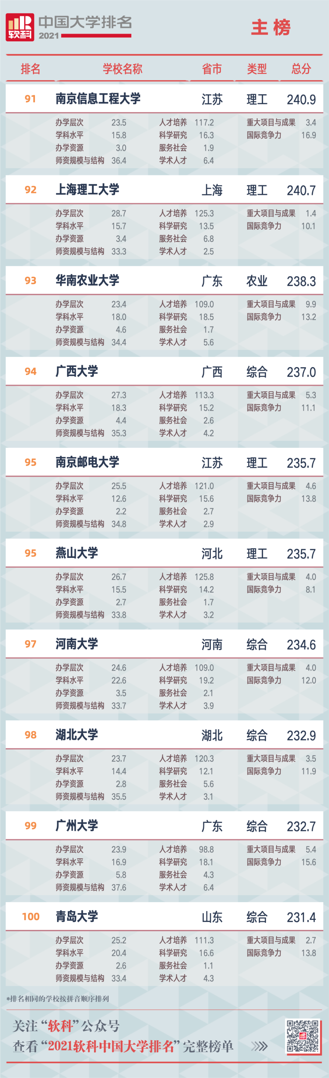 “雙一流”高校在排名中占絕對優(yōu)勢地位,百強高校中有86所為“雙一流”高校,其中廣西大學(xué)排名較2020年上升7名,躋身全國百強,位列全國第94,至此“雙一流”高校在百強榜單再增一席。