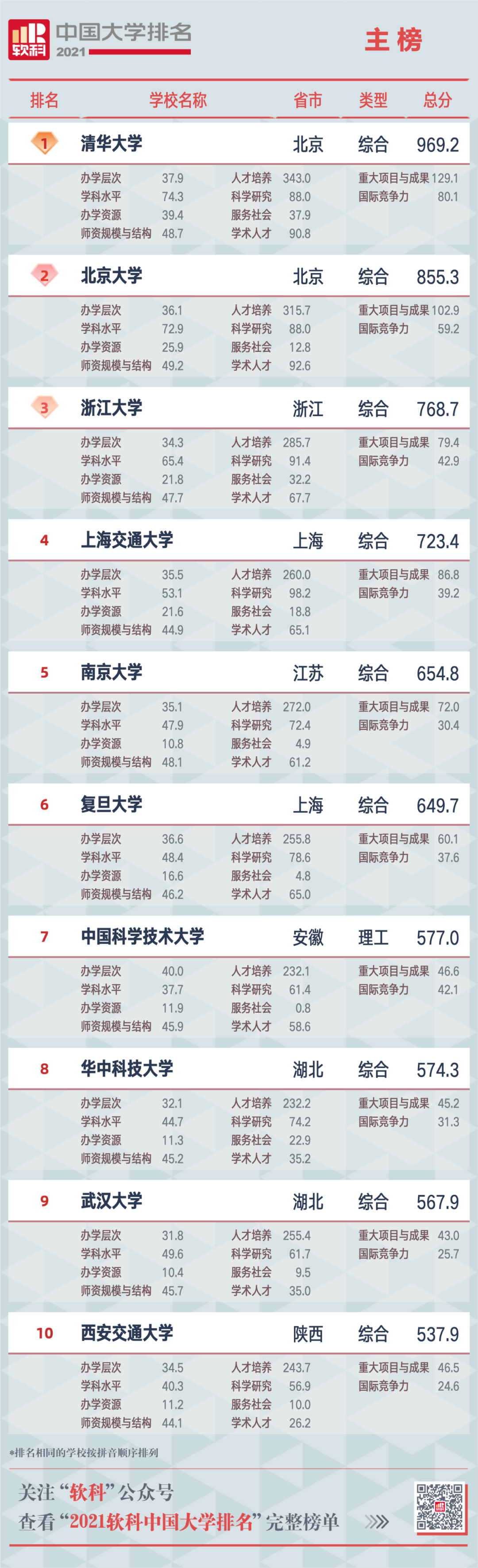 @2022考研er,2021軟科中國大學(xué)排名(主榜)的上榜高校共有582所,清華大學(xué)、北京大學(xué)、浙江大學(xué)占據(jù)前三,想知道你的目標(biāo)院校排名是多少嗎?一起來看~
