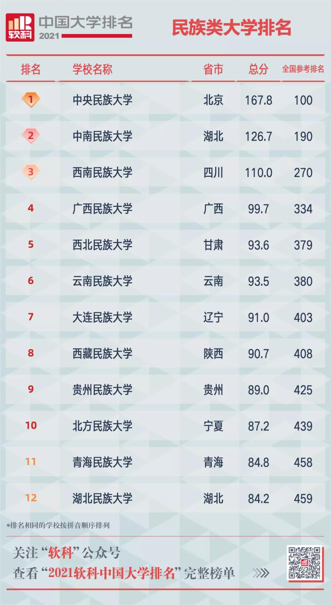 2021軟科中國民族類大學(xué)排名的上榜高校有12所,中央民族大學(xué)、中南民族大學(xué)、西南民族大學(xué)位列前三。