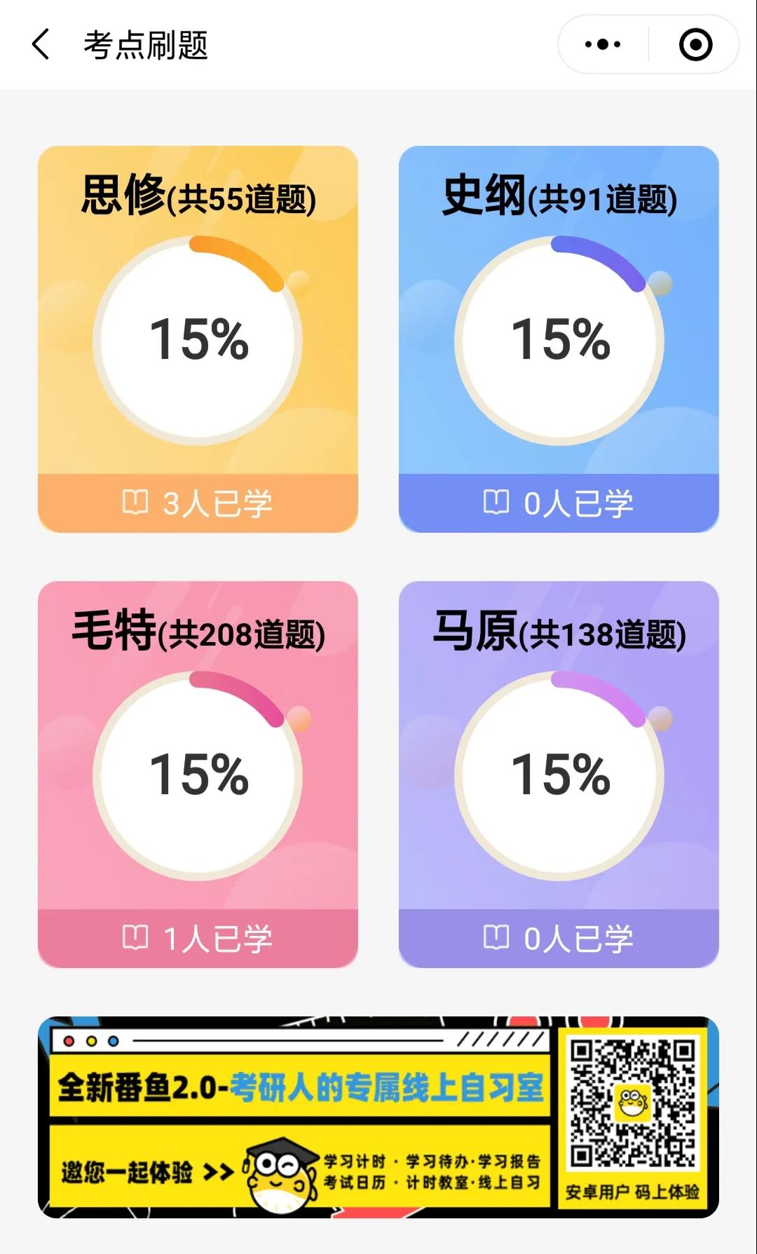 為了方便同學(xué)們能夠隨時(shí)隨地刷題,研線團(tuán)隊(duì)送上刷題神器——考研政治刷題大師微信小程序。