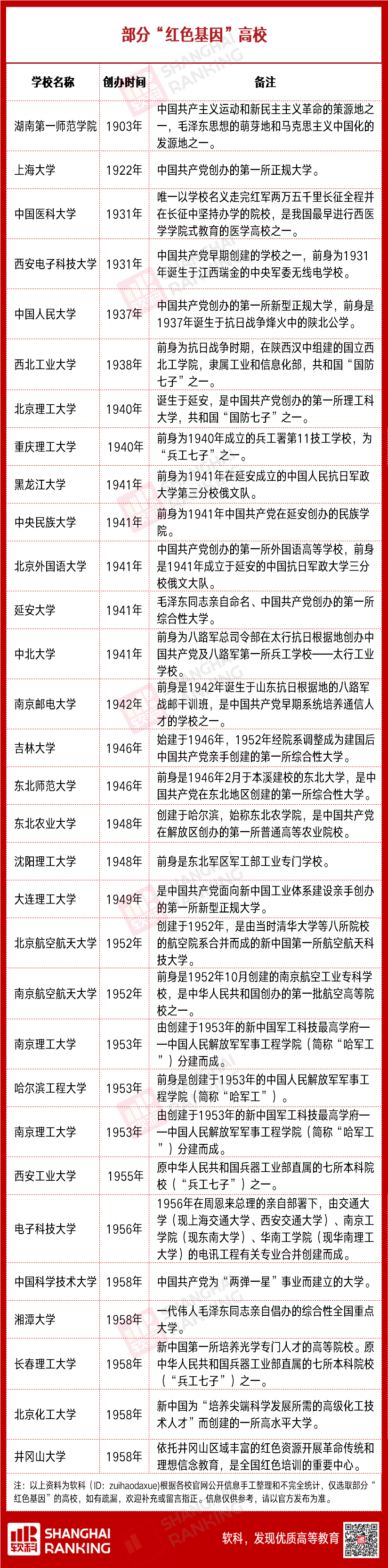 教育是國之大計,黨之大計。大力發(fā)展教育事業(yè),在黨的執(zhí)政方針中占據(jù)重要位置。有這么一批高校,或由中國共產黨親手創(chuàng)辦、或誕生于中國抗戰(zhàn)烽火之中、或建立于中共革命根據(jù)地,這些高校于偉大的時代誕生,亦因其根正苗紅的“紅色基因”,在當今,散發(fā)著鮮亮的紅色光芒。本文選取了部分“紅色基因”高校,這些大學在歷史的錘煉中,歷久彌新,熠熠生輝。軟科(ID:zuihaodaxue)根據(jù)各校官網(wǎng)公開信息手工整理和不完全統(tǒng)計,如有疏漏,歡迎補充或留言指正。