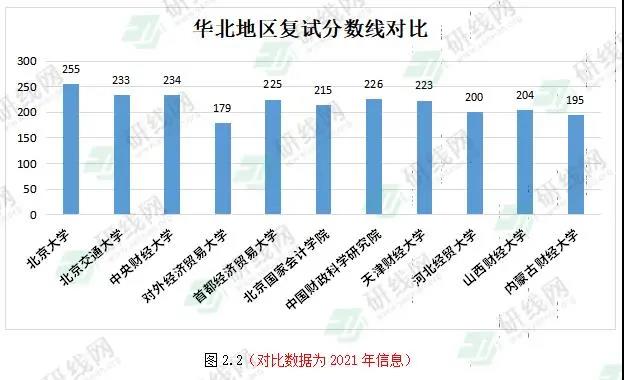 以華北地區(qū)院校復(fù)試分?jǐn)?shù)線為例,北京大學(xué)、中央財(cái)經(jīng)大學(xué)、北京交通大學(xué)高居前三名,低于200分的院校為對(duì)外經(jīng)濟(jì)貿(mào)易大學(xué)和內(nèi)蒙古財(cái)經(jīng)大學(xué)。整體來(lái)看,華北地區(qū)院校復(fù)試分?jǐn)?shù)線普遍較高。
