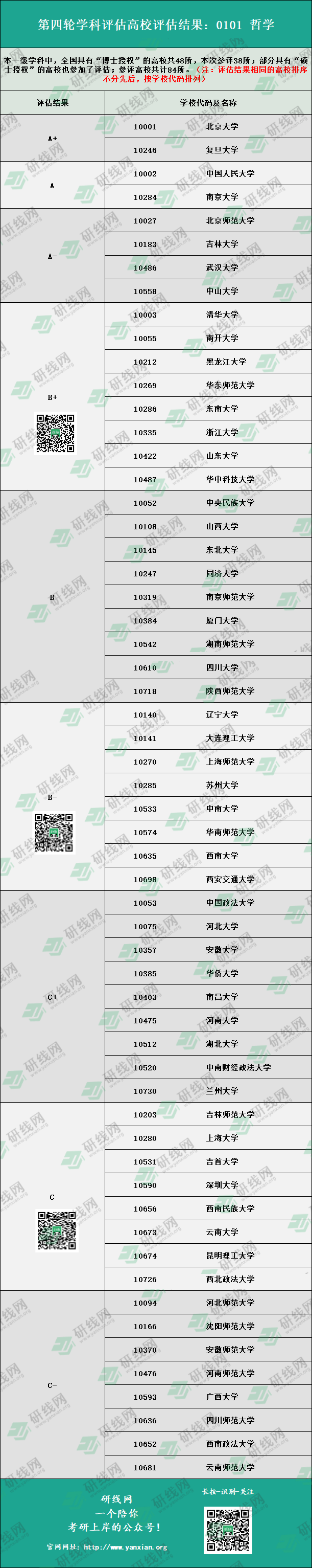 下面是全國第四輪學科評估結果 10101 哲學 的院校排名,供大家擇校參考。(注:評估結果相同的高校排序不分先后,按學校代碼排列)
