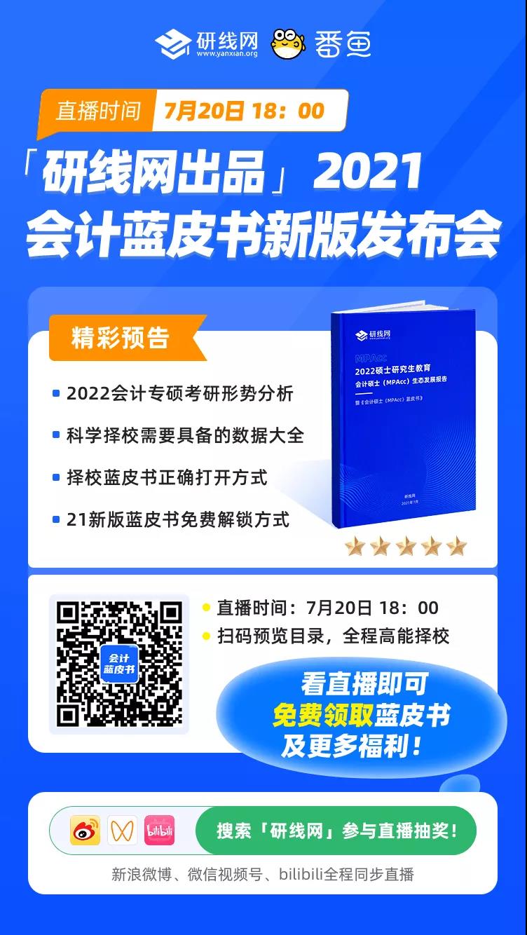 通知,通知!【研線網(wǎng)出品】2021碩士研究生教育會(huì)計(jì)碩士(MPAcc)生態(tài)發(fā)展報(bào)告暨《會(huì)計(jì)碩士(MPAcc)藍(lán)皮書》?。ㄒ韵潞?jiǎn)稱“22考研會(huì)計(jì)擇校藍(lán)皮書”)將于2021年7月22日上午10:00正式發(fā)布了!