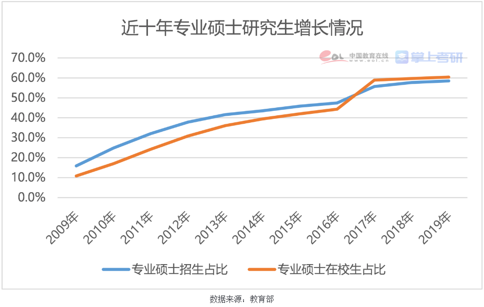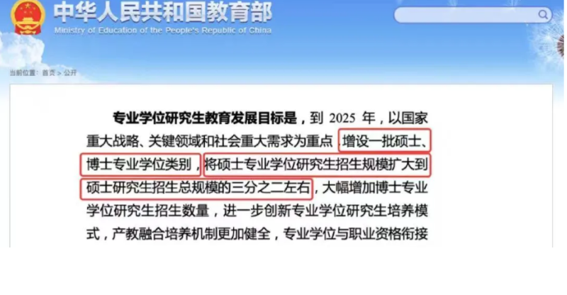 教育部在《專業(yè)學(xué)位研究生教育發(fā)展方案(2020-2025)》中表示:到2025年,以國(guó)家重大戰(zhàn)略、關(guān)鍵領(lǐng)域和社會(huì)重大需求為重點(diǎn),增設(shè)一批碩士、博士專業(yè)學(xué)位類別,將碩士專業(yè)學(xué)位研究生招生規(guī)模擴(kuò)大到碩士研究生招生總規(guī)模的三分之二左右,大幅增加博士專業(yè)學(xué)位研究生招生數(shù)量。