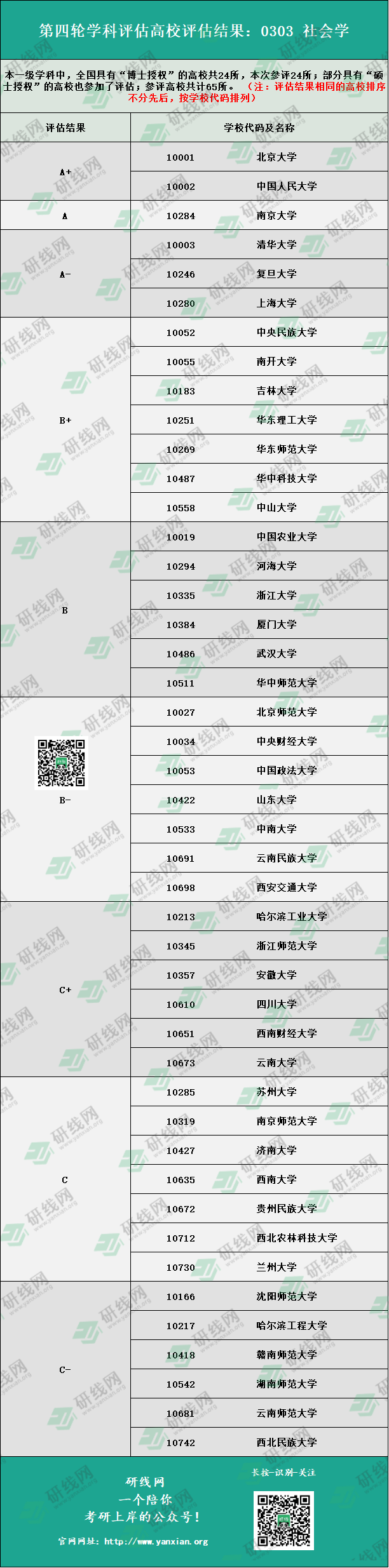 下面是全國第四輪學科評估結(jié)果 0303 社會學 的院校排名,供大家擇校參考。(注:評估結(jié)果相同的高校排序不分先后,按學校代碼排列)