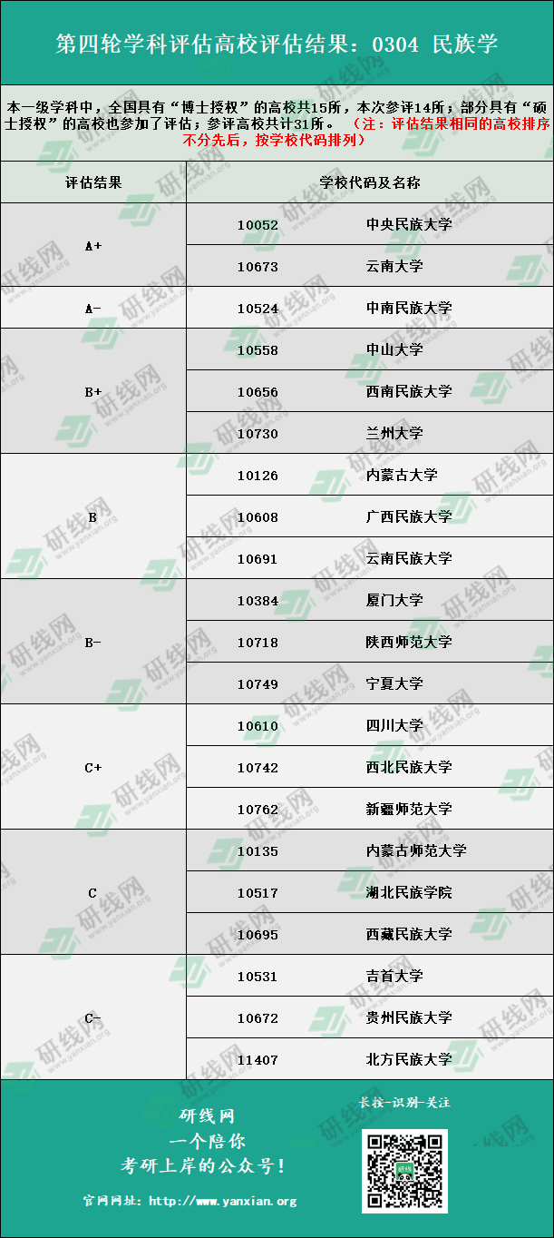 “0304 民族學”,一級學科中,全國具有“博士授權”的高校共15所,本次參評14所;部分具有“碩士授權”的高校也參加了評估;參評高校共計31所。