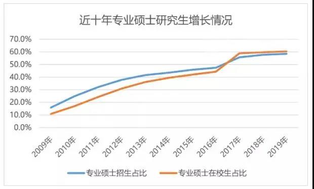 自2017年起,專業(yè)碩士招生規(guī)模始終高于學(xué)術(shù)學(xué)位碩士。2019年,碩士研究生招生81.1萬人,專碩招生規(guī)模達(dá)47.4萬人,占比為58.5%。2019年,專業(yè)碩士研究生在校生147.4萬人,占比60.4%。