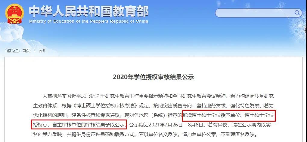 7月26日,教育部發(fā)布《2020年學位授權審核結(jié)果公示》,對各地區(qū)(系統(tǒng))推薦的