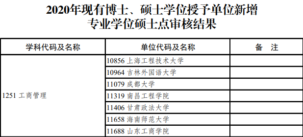 在《2020年學位授權審核結(jié)果公示》中,新增管理類聯(lián)考(七大專業(yè))專業(yè)學位碩士共計178個,以下是詳細名單: