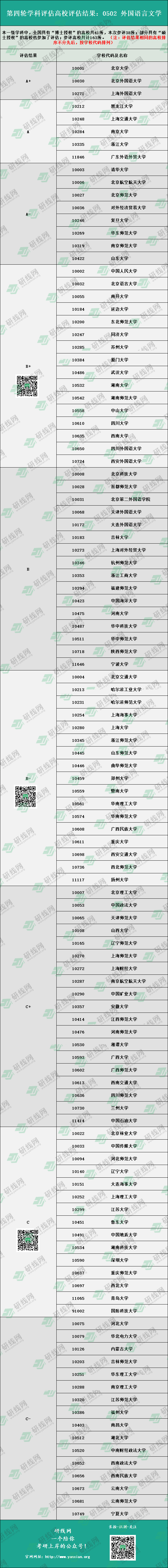 下面是全國第四輪學(xué)科評估結(jié)果[0502 外國語言文學(xué)]的院校排名,供大家擇校參考。(注:評估結(jié)果相同的高校排序不分先后,按學(xué)校代碼排列)