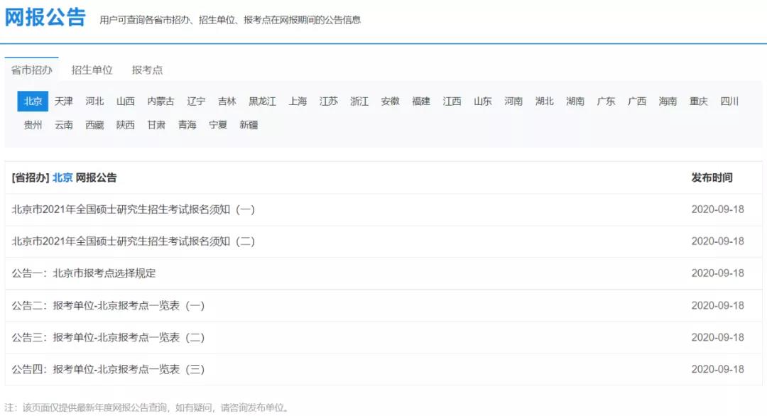 如果你想查詢各省市招辦、招生單位、報考點在網(wǎng)報期間的公告信息,就需要看看往年該地網(wǎng)報公告上的一些要求,網(wǎng)報公告版塊會集中展示省市招辦、招生單位、報考點在網(wǎng)報期間報考的要求。
