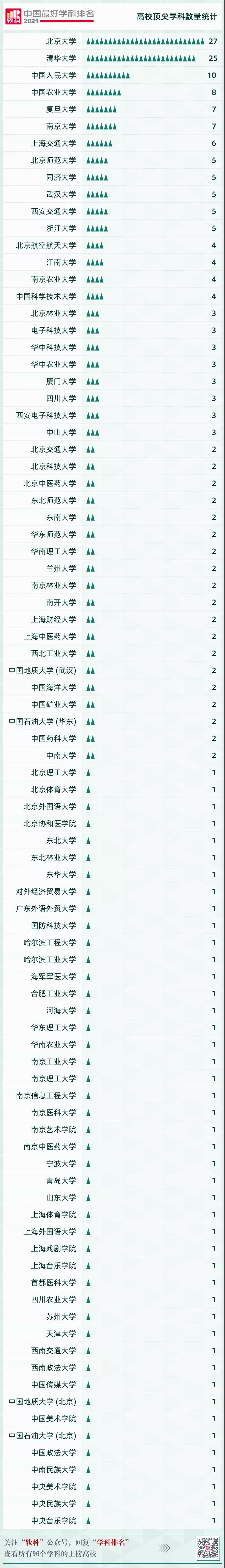 以下是2021軟科中國最好學(xué)科排名96個學(xué)科的前10%高校。