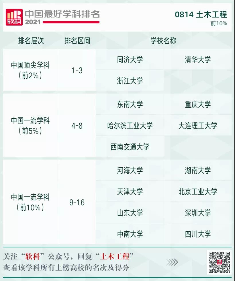 土木工程學(xué)科排名前10%的高校: