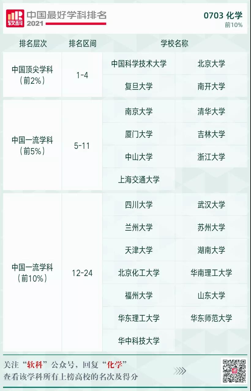 化學(xué)學(xué)科排名前10%的高校: