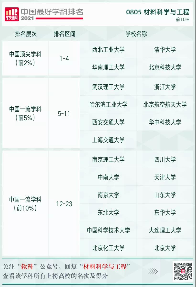 材料科學(xué)與工程學(xué)科排名前10%的高校: