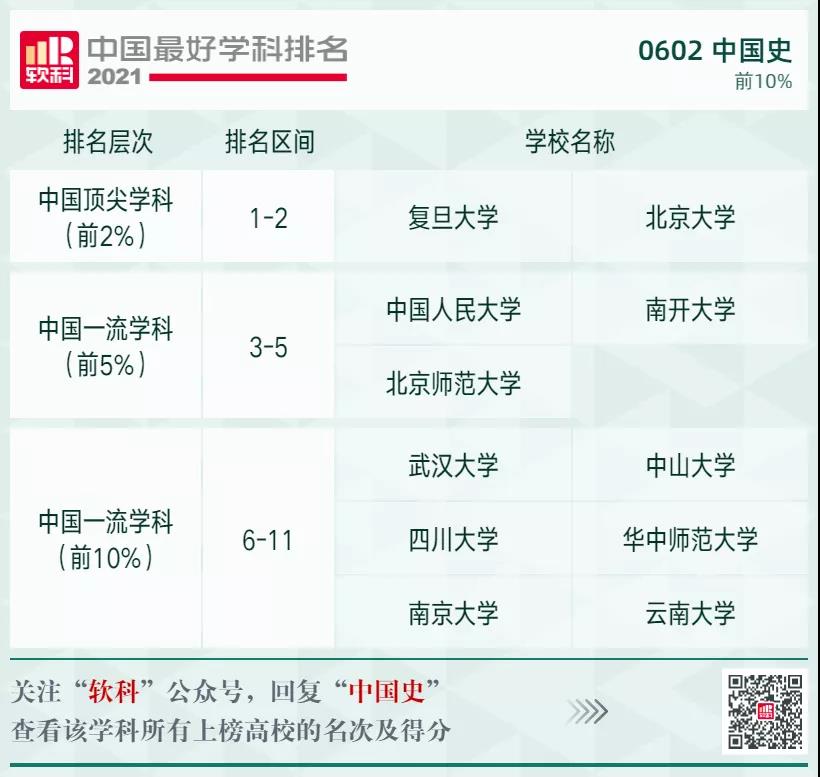 中國史學(xué)科排名前10%的高校: