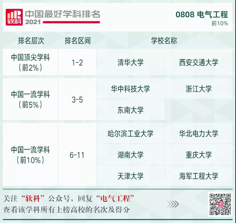 電氣工程學(xué)科排名前10%的高校: