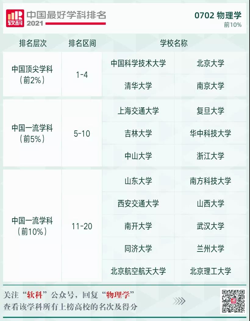 物理學(xué)學(xué)科排名前10%的高校: