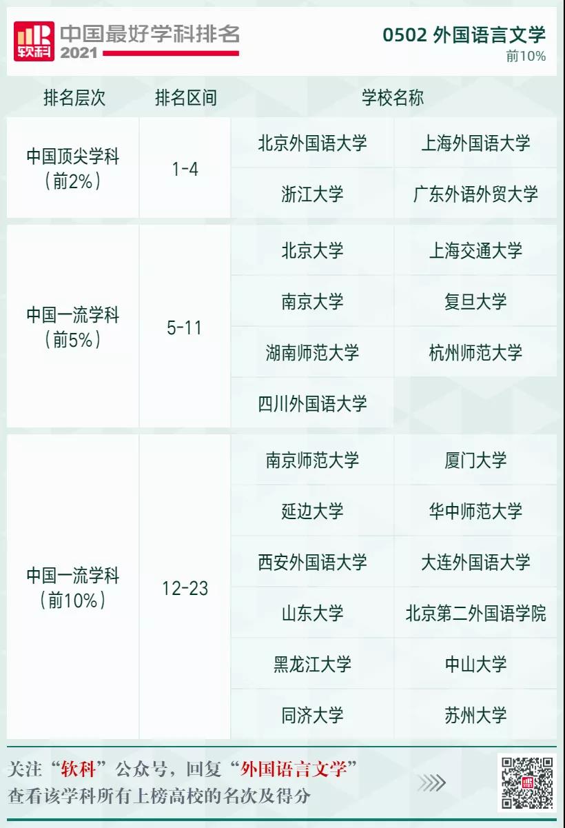 外國語言文學(xué)學(xué)科排名前10%的高校: