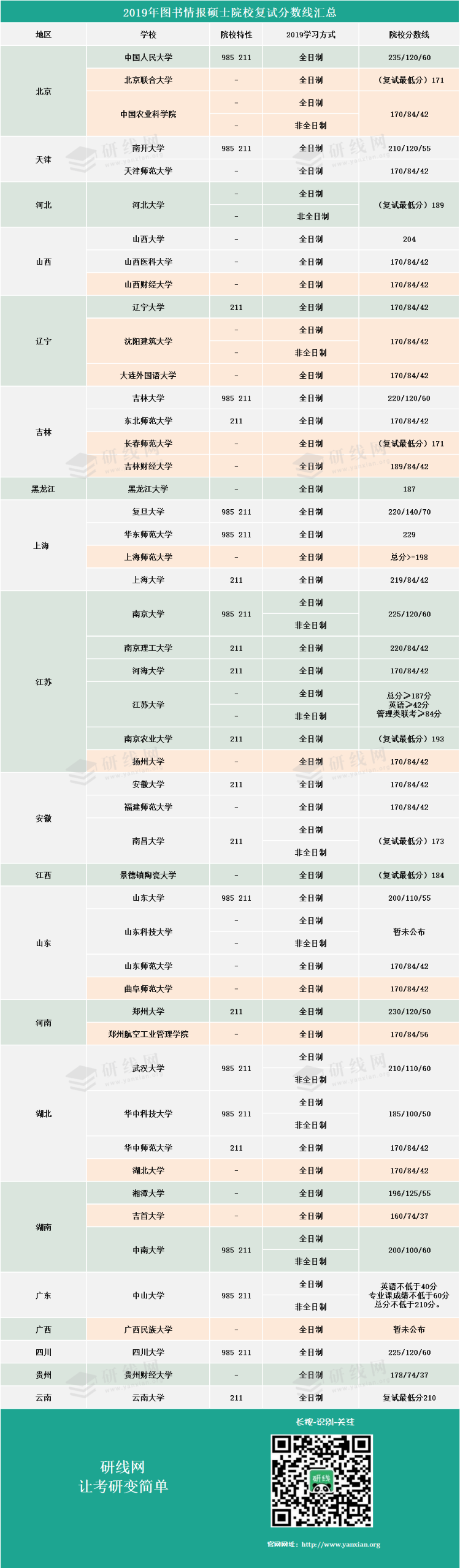 2019年圖書情報(bào)(MLIS )49所院校復(fù)試分?jǐn)?shù)線匯總