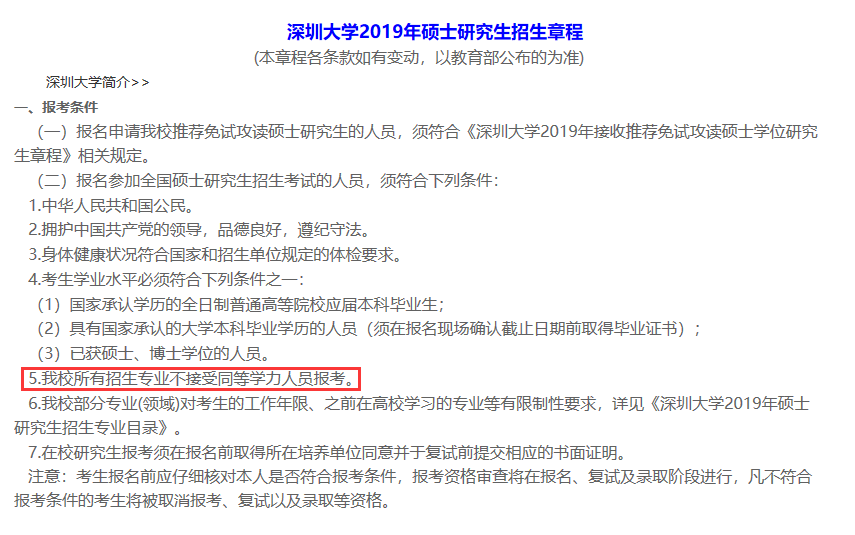 以同等學(xué)力身份報(bào)考需要注意,認(rèn)真看招生單位的招生簡(jiǎn)章關(guān)于同等學(xué)力的要求,有些學(xué)校不接受同等學(xué)力報(bào)考,比如深圳大學(xué)在招生簡(jiǎn)章會(huì)明確說(shuō)明:我校所有招生專(zhuān)業(yè)不接受同等學(xué)力人員報(bào)考。