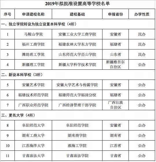 名單中包含,“獨立學(xué)院轉(zhuǎn)設(shè)為獨立設(shè)置本科學(xué)校”4所,“新設(shè)本科學(xué)校”3所,“更名大學(xué)”4所,具體如下: