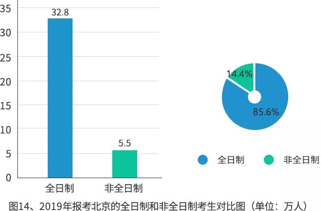 32.8萬人報考全日制碩士研究生,約占85.6%;5.5萬人報考非全日制碩士研究生,約占14.4%。