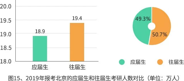 應(yīng)屆研考生有18.9萬人,約占49.3%;非應(yīng)屆研考生有19.4萬人,約占50.7%。