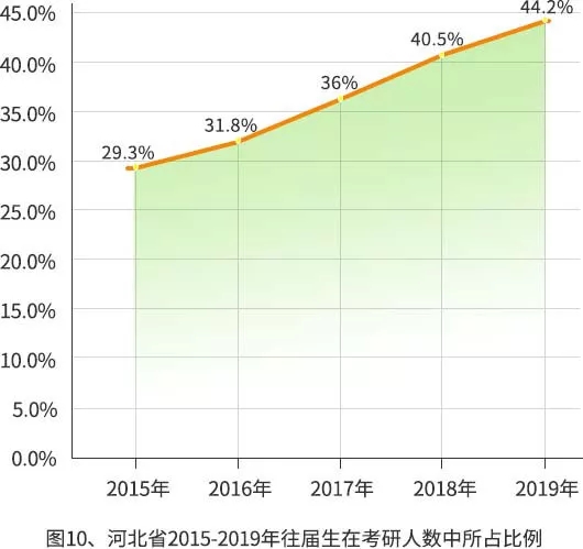 河北省2015年往屆生所占比例為29.3%,到2019年這個比例升至44.2%: