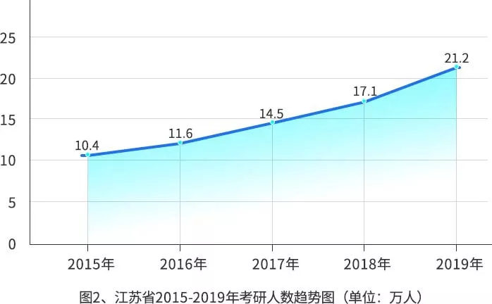 江蘇省一直是考研大省,從2015年的10.4萬人到2019年的21.2萬人,5年間,考研人數(shù)翻了一番還多。
