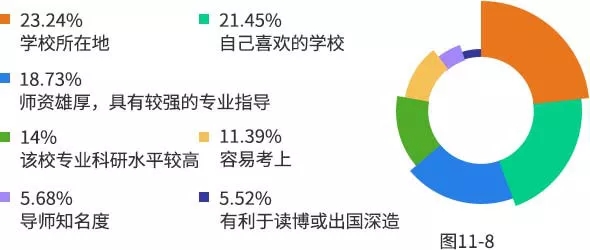 分析:從調(diào)查結(jié)果可知,學(xué)校所在地和本人對報考院校的心儀程度是大部分考生選擇報考選校的重要因素。同時,師資情況和學(xué)校考研水平的高低等軟件條件也是考生們非常關(guān)注的因素。