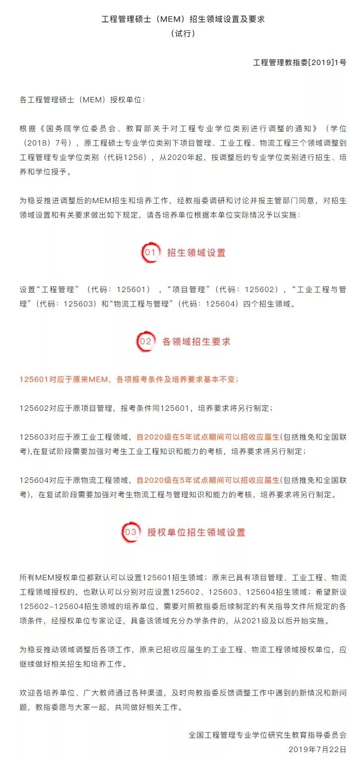 近日,全國(guó)工程管理專業(yè)學(xué)位研究生教育指導(dǎo)委員會(huì)發(fā)布了2019工程管理碩士(MEM)招生領(lǐng)域設(shè)置及要求 。今天,小編給大家整理了相關(guān)文件內(nèi)容,希望對(duì)有報(bào)考工程管理專業(yè)學(xué)位意愿的同學(xué)有所幫助!